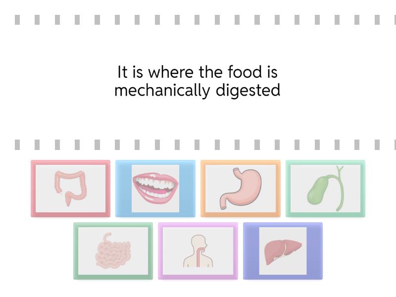It is where the food is mechanically digested, It is where the water from the undigested food is absorbed, It temporarily expand to store food, It add substances in the chyme to break down food further and it also absorbs nutrients from the food and prepares it for circulation throughout the body., It contracts in a rhythmic and wavelike motion to push the chewed food in the stomach., It produces bile that helps break down the fats., It is a small sac where bile is stored.,