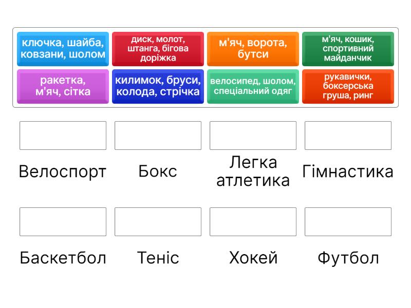 м'яч, кошик, спортивний майданчик - Баскетбол, м'яч, ворота, бутси - Футбол, велосипед, шолом, спеціальний одяг - Велоспорт, ключка, шайба, ковзани, шолом - Хокей, килимок, бруси, колода, стрічка - Гімнастика, рукавички, боксерська груша, ринг - Бокс, диск, молот, штанга, бігова доріжка - Легка атлетика, ракетка, м'яч, сітка - Теніс,