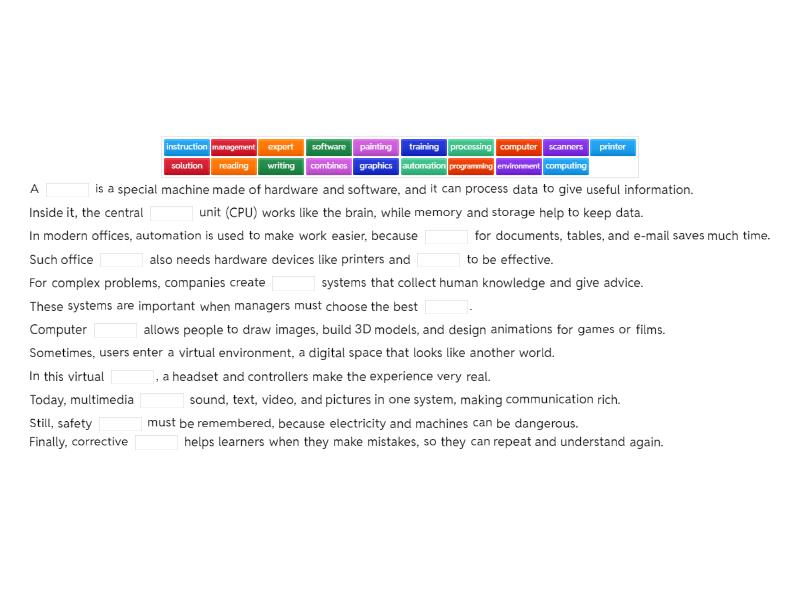 A ____ is a special machine made of hardware and software, and it can process data to give useful information. Inside it, the central ____ unit (CPU) works like the brain, while memory and storage help to keep data. In modern offices, automation is used to make work easier, because ____ for documents, tables, and e-mail saves much time. Such office ____ also needs hardware devices like printers and ____ to be effective. For complex problems, companies create ____ systems that collect human knowledge and give advice. These systems are important when managers must choose the best ____. Computer ____ allows people to draw images, build 3D models, and design animations for games or films. Sometimes, users enter a virtual environment, a digital space that looks like another world. In this virtual ____, a headset and controllers make the experience very real. Today, multimedia ____ sound, text, video, and pictures in one system, making communication rich. Still, safety ____ must be remembered, because electricity and machines can be dangerous. Finally, corrective ____ helps learners when they make mistakes, so they can repeat and understand again.