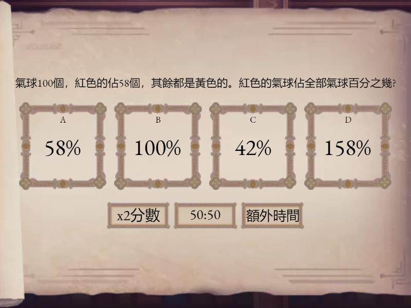 1) 氣球100個,紅色的佔58個,其餘都是黃色的。紅色的氣球佔全部氣球百分之幾? a) 58% b) 100% c) 42% d) 158% 2) 絲帶50卷,粉紅色的佔27卷,其餘都是藍色的。粉紅色的絲帶佔全部絲帶的百分之幾? a) 27% b) 54% c) 50% d) 23% 3) 童軍有25人,男童軍佔15人,其餘的都是女童軍。男童軍佔全部童軍的百分之幾? a) 25% b) 15% c) 60% d) 60 4) 圖書有20本,中文圖書有11本,其餘的都是英文圖書。中文圖書佔全部圖書的百分之幾? a) 11% b) 20% c) 9% d) 44%