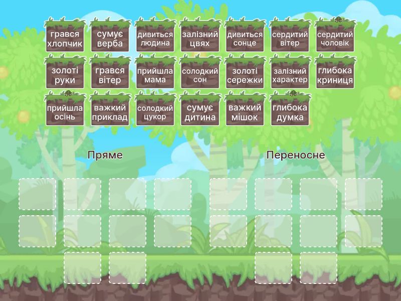 Пряме: сумує дитина, залізний цвях, глибока криниця, важкий мішок, солодкий цукор, дивиться людина, прийшла мама, золоті сережки, сердитий чоловік, грався хлопчик, Переносне: сумує верба, залізний характер, глибока думка, важкий приклад, солодкий сон, дивиться сонце, прийшла осінь, золоті руки, сердитий вітер, грався вітер,