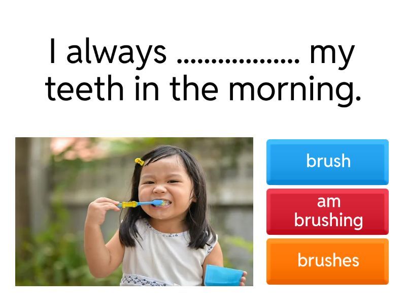 1) I always .................. my teeth in the morning. a) brush b) am brushing c) brushes 2) She usually ................. her lunch at the canteen. a) eat b) eats c) is eating 3) ............. you ................ tennis every weekend? a) Do / play b) Does / play c) Do/plays 4) ............... she ................... volleyball at the weekends? a) Does/plays b) Does/play c) Do/play 5) ................ you ............. for the exam right now? a) Are/studying b) Do/you c) Are/study 6) We ...................... our rooms at the moment. a) clean b) are cleaning c) cleans 7) Is he reading book? Yes, .............. a) I am. b) he isn't. c) he is. 8) ............... you ............ to the cinema tonight? a) Do/come b) Are/coming c) Is/coming 9) Does she sleep in her room? Yes, ............ a) she is. b) she does. c) she doesn't. 10) Do you like coffee? No, ................. a) I don't. b) I do. c) he don't. 11) Mary ................... eating salad. a) don't like b) doesn't like c) like 12) Children .............. playing football at the breaktime. a) love b) loves c) doesn't love
