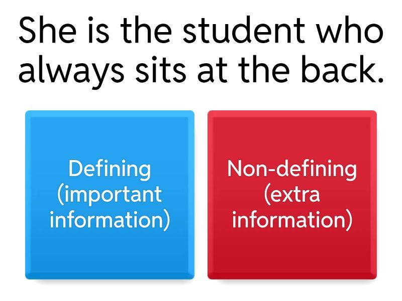1) She is the student who always sits at the back. a) Defining (important information) b) Non-defining (extra information) 2) My brother Ben, who lives in Paris, is an architect. a) Defining (important information) b) Non-defining (extra information) 3) Grace works for the company which makes furniture. a) Defining (important information) b) Non-defining (extra information) 4) We know a lot of people who live in the city. a) Defining (important information) b) Non-defining (extra information) 5) London, which is the capital of England, is one of the largest cities in the world. a) Defining (important information) b) Non-defining (extra information) 6) An architect is someone who designs buildings. a) Defining (important information) b) Non-defining (extra information) 7) John, who can speak French and Italian, works as a tour guide. a) Defining (important information) b) Non-defining (extra information) 8) Where is the cheese that was in the fridge? a) Defining (important information) b) Non-defining (extra information) 9) The new stadium, which can hold 90,000 people, will build next year. a) Defining (important information) b) Non-defining (extra information) 10) I don’t like stories that have unhappy endings. a) Defining (important information) b) Non-defining (extra information)