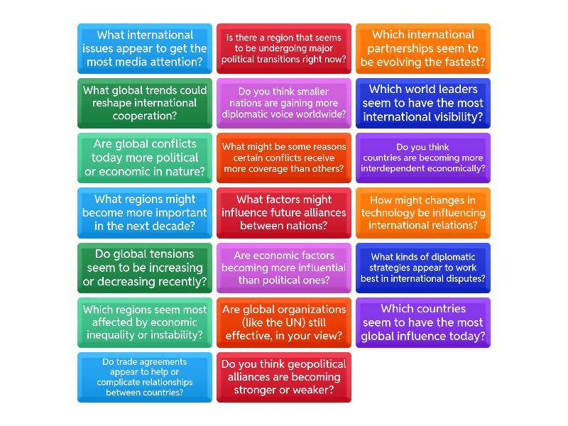 Which countries seem to have the most global influence today?, What international issues appear to get the most media attention?, Do you think geopolitical alliances are becoming stronger or weaker?, What regions might become more important in the next decade?, Are economic factors becoming more influential than political ones?, Do you think smaller nations are gaining more diplomatic voice worldwide?, What might be some reasons certain conflicts receive more coverage than others?, Which world leaders seem to have the most international visibility?, Are global organizations (like the UN) still effective, in your view?, How might changes in technology be influencing international relations?, Do global tensions seem to be increasing or decreasing recently?, What kinds of diplomatic strategies appear to work best in international disputes?, Which regions seem most affected by economic inequality or instability?, Do trade agreements appear to help or complicate relationships between countries?, Is there a region that seems to be undergoing major political transitions right now?, What global trends could reshape international cooperation?, Do you think countries are becoming more interdependent economically?, Which international partnerships seem to be evolving the fastest?, Are global conflicts today more political or economic in nature?, What factors might influence future alliances between nations?,