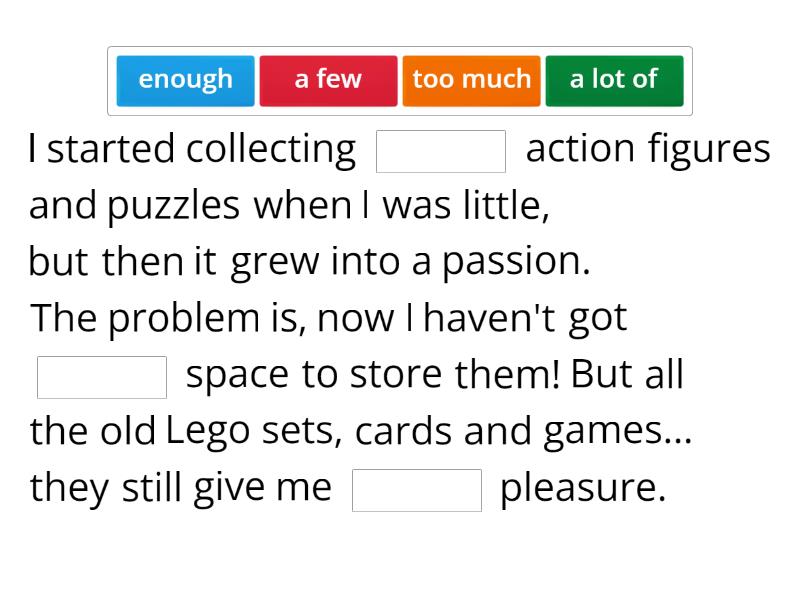 I started collecting ____ action figures and puzzles when I was little, but then it grew into a passion. The problem is, now I haven't got ____ space to store them! But all the old Lego sets, cards and games... they still give me ____ pleasure. I haven't got one bedroom. I've got two! I needed ____ space for my collection. I've got about 50 pairs of sandals, even more stilettos, but ____ boots. I'm not so keen on those. My boyfriend thinks I've got far ____ boxes everywhere, but it's important to store each pair properly! ____ do I have? I don't know, but every shelf is full of them. I spent ____ time choosing them. Of course, I've read every one. ____ money are they worth? To me they're priceless. ____ people pay much attention to these. They just put them on an envelope, then they're done. But to me, they're tiny works of art. Some cost ____ money, others cost millions! I spend ____ time looking for new additions every week. But not too long - I also have other hobbies!
