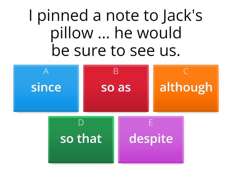 1) I pinned a note to Jack's pillow ... he would be sure to see us. a) since b) so as c) although d) so that e) despite 2) Our apartment is being decorated, ... my parents can sell it. a) because of b) in order c) so as d) so that  e) despite 3) Let's run though the arrangements for tomorrow's visit ... we all know what we are meant to do. a) so that b) so as c) despite d) in order e) because of 4) She took some water ... she wouldn't get thirsty. a) so that b) so as c) although d) since e) despite 5) If I were short-sighted, I'd have laser treatment on my eyes ... I could do without wearing glasses. a) despite b) so as c) since d) although e) so that 6) I go to the doctor every six month for a check-up ... I know that I'm healthy. a) since b) so that c) despite d) so as e) because of 7) There were telephone points every kilometre ... drives whose cars had broken down would be able to summon help. a) so that b) despite c) although d) since e) so as 8) I have laid your notebook on the table by the door ... you won't forget it. a) so as b) because of c) in order d) despite e) so that