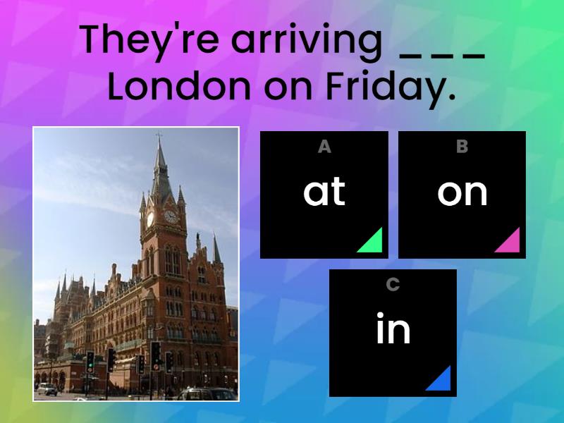 1) They're arriving ___ London on Friday. a) at b) on c) in 2) That suitcase belongs ___ me. a) for b) from c) to 3) Shall we ask someone ___ directions? a) at b) for c) of 4) We might go camping, but it depends ___ the weather. a) in b) of c) on 5) Everybody laughed ___ me when I fell off the chair. a) about b) at c) to 6) Who's going to pay ___ the meal? a) for b) of c) with 7) I dreamt ___ my old school friends last night. a) about b) from c) with 8) That girl reminds me ___ my cousin. a) about b) of c) to