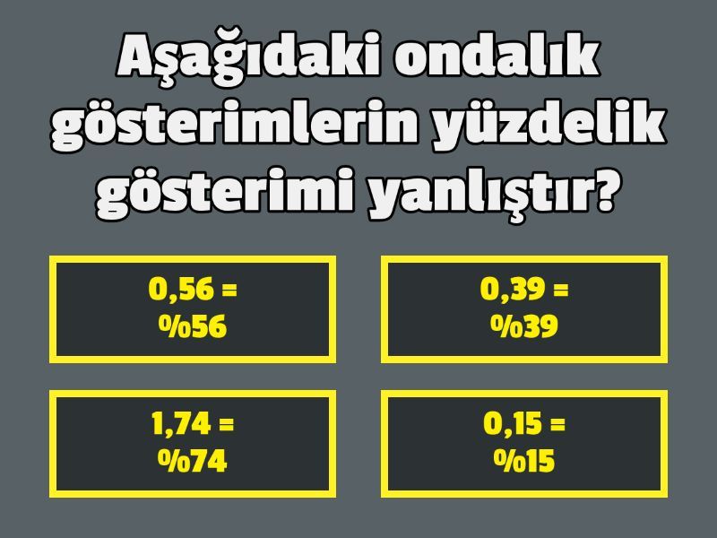 1) Aşağıdaki ondalık gösterimlerin yüzdelik gösterimi yanlıştır? a) 0,56 = %56 b) 0,39 = %39 c) 1,74 = %74 d) 0,15 = %15 2) Yandaki dikdörtgenin uzun kenarı 13 cm , kısa kenarı 7 cm ise alanı kaç cm'dir? a) 92 cm b) 90 cm c) 93 cm d) 91 cm 3) Yandaki üçgen bir ikizkenar üçgendir, bir açısı 40 derecedir diğer açıları kaç derecedir? a) 69 - 69 b) 70 - 70 c) 69 - 70 d) 71 - 71 4) Karenin bir kenar uzunluğu 8 cm ise çevresi kaç cm'dir? a) 32 b) 34 c) 24 d) 31 5) Yandaki işlemin sonucu kaçtır? a) 26 sa. 4 dk. 11 sn. b) 26 sa. 4 dk. 9 sn. c) 26 sa. 4 dk. 10 sn. d) 26 sa. 5 dk. 10 sn. 6) Bir üçgenin iç açıları toplamı kaçtır? a) 181 b) 360 c) 90 d) 180 7) Bir dörtgenin iç açıları toplamı kaçtır? a) 180 b) 360 c) 90 d) 361 8) Aşağıda bir eşkenar dörtgenin özellikleri yanlış verilmiştir? a) Bütün kenar uzunlukları eşittir. b) Karşılıklı kenarları paraleldir. c) Köşegenleri birbirine dik değildir. d) Karşılıklı açı ölçüleri eşittir. 9) Görseldeki açı nasıl bir açıdır ve kaç derecedir? a) Dik açı - 90 derece b) Dik açı - 88 derece c) Geniş açı - 91 derece d) Dar açı - 90 derece 10) Görseldeki üçgen nasıl bir üçgendir? a) Dar açılı üçgen b) Dik açılı üçgen c) Eşkenar üçgen d) Geniş açılı üçgen 11) Görseldeki üçgen kenarlarına göre nasıl bir üçgendir ve açıları kaç derecerir? a) İkizkenar üçgen - iki açısı 80 derece b) Eşkenar üçgen - tüm açıları 60 derece c) Eşkenar üçgen - tüm açıları 61 derece d) Çeşitkenar üçgen - bir açısı 60 derece 12) Bir üçgenin dar açılı olabilmesi için açıları nasıl olmalıdır? a) 70-70-45 b) 30-30-120 c) 30-60-90 d) 60-60-60 13) Aşağıdaki çevirilerden hangisi doğrudur? a) 80 cm - 8 m b) 4 hm - 0,04 km c) 50 dam - 0,5 km d) 8,91 m - 8910 cm 14) Bir çeşitkenar üçgenin uzunlukları 12 cm,19 cm,6 cm olduğuna göre çevresi kaç mm'dir? a) 370 mm b) 37 cm c) 3700 mm d) 370 cm