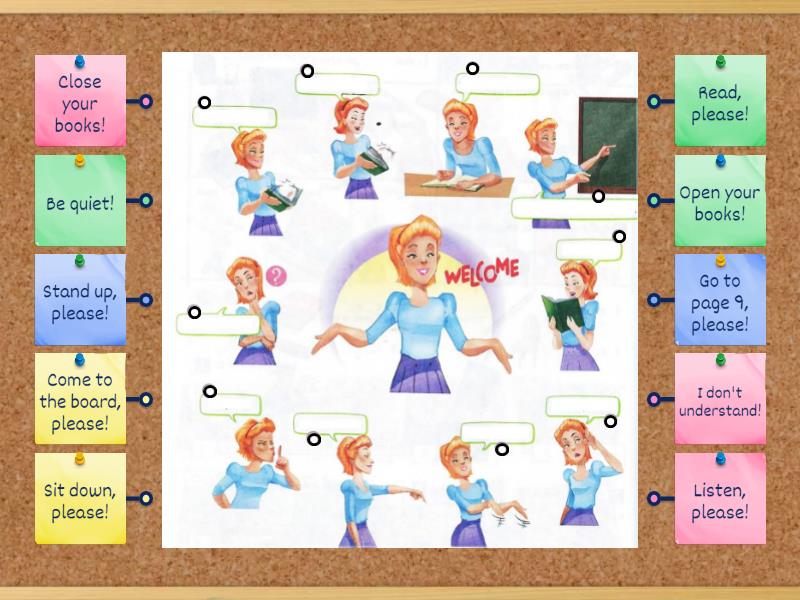 Open your books!, Close your books!, Go to page 9, please!, Come to the board, please!, Read, please!, Listen, please!, Stand up, please!, Sit down, please!, Be quiet!, I don't understand!.