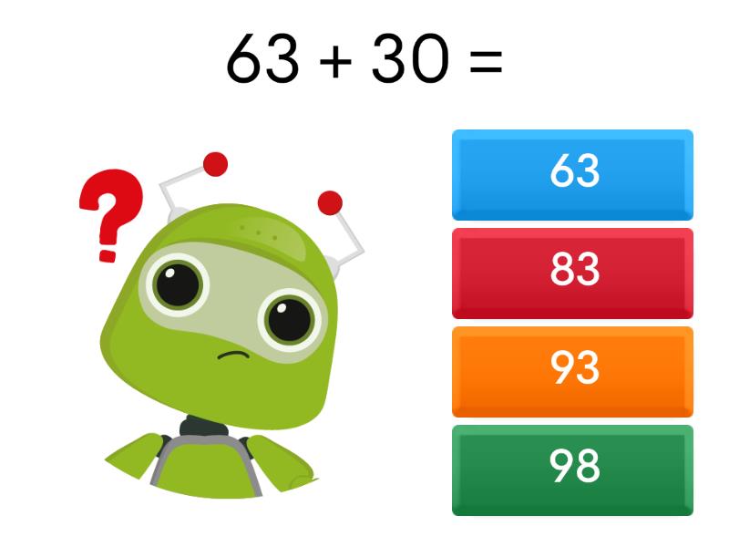 1) 63 + 30 = a) 63 b) 83 c) 93 d) 98 2) 34 + 12 = a) 46 b) 49 c) 64 d) 67 3) 82 + 17 = a) 70 b) 72 c) 87 d) 99 4) 46 + 21 = a) 57 b) 67 c) 74 d) 80 5) 38 + 20 = a) 39 b) 45 c) 56 d) 58 6) 37 + 14 = a) 51 b) 52 c) 61 d) 68 7) 11 + 66 = a) 77 b) 78 c) 84 d) 91 8) 10 + 77 = a) 46 b) 76 c) 87 d) 93 9) 39 + 39 = a) 36 b) 78 c) 81 d) 97 10) 80 + 13 = a) 55 b) 69 c) 82 d) 93 11) 45 + 36 = a) 77 b) 81 c) 86 d) 95 12) 25 + 30 = a) 42 b) 55 c) 61 d) 68 13) 53 + 46 = a) 54 b) 78 c) 91 d) 99 14) 65 + 12 = a) 57 b) 72 c) 76 d) 77 15) 49 + 17 = a) 53 b) 56 c) 60 d) 66 16) 22 + 55 = a) 47 b) 77 c) 81 d) 84 17) 77 + 11 = a) 80 b) 87 c) 88 d) 92 18) 40 + 46 = a) 64 b) 66 c) 83 d) 86 19) 61 + 30 = a) 77 b) 79 c) 91 d) 94 20) 69 + 19 = a) 62 b) 81 c) 87 d) 88