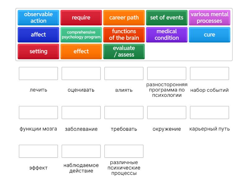 comprehensive psychology program - разносторонняя программа по психологии, functions of the brain - функции мозга, various mental processes - различные психические процессы, require - требовать, affect - влиять, effect - эффект, career path - карьерный путь, medical condition - заболевание, cure - лечить, observable action - наблюдаемое действие, evaluate / assess - оценивать, setting - окружение, set of events - набор событий,