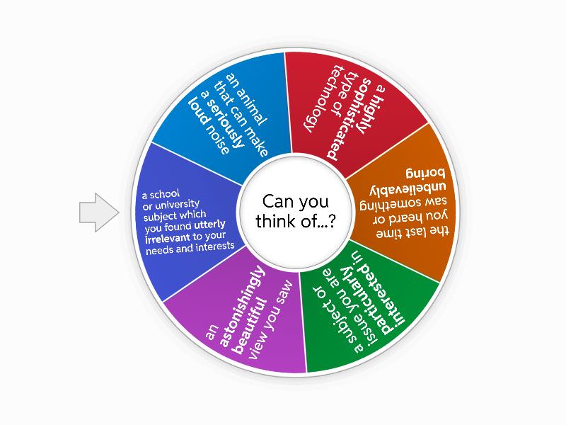 an animal that can make a seriously loud noise, a highly sophisticated type of technology, the last time you heard or saw something unbelievably boring, a subject or issue you are particularly interested in, an astonishingly beautiful view you saw, a school or university subject which you found utterly irrelevant to your needs and interests.
