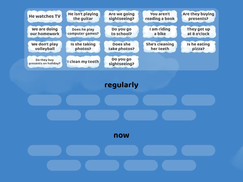regularly: I clean my teeth, He watches TV, We don't play volleyball, Do you go sightseeing?, Do you go to school?, Does she take photos?, They get up at 8 o'clock, Does he play computer games?, Do they buy presents on holiday?, now: She's cleaning her teeth, We are doing our homework, I am riding a bike, Are we going sightseeing?, He isn't playing the guitar, Is she taking photos?, You aren't reading a book, Is he eating pizza?, Are they buying presents?,