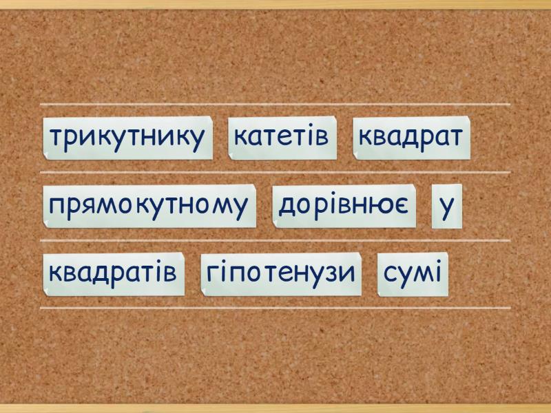 у прямокутному трикутнику квадрат гіпотенузи дорівнює сумі квадратів катетів, щоб знайти квадрат катета прямокутного трикутника треба від квадрата гіпотенузи відняти квадрат невідомого катета, сторони що утворюють прямий кут називаютися катетами, сторона що лежить проти прямого кута називається гіпотенузою,