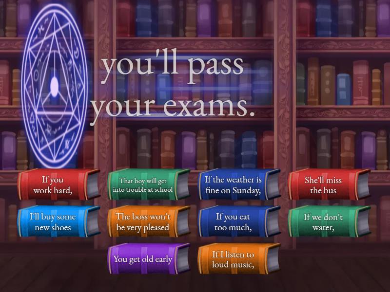 If you work hard, - you'll pass your exams., If we don't water, - the flowers die., The boss won't be very pleased - if you're late for the meeting., If the weather is fine on Sunday, - we'll go for a long walk., I'll buy some new shoes - if I have enough money., You get old early - if you smoke., She'll miss the bus - if she doesn't leave soon., That boy will get into trouble at school - if he doesn't wear his uniform., If I listen to loud music, - I always have a headache., If you eat too much, - you get fat.,
