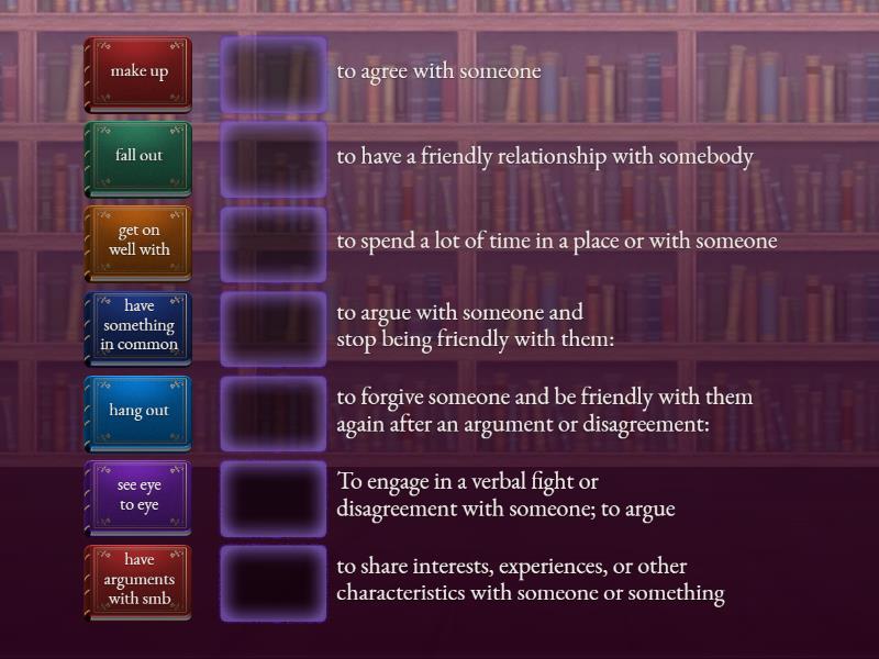 hang out - to spend a lot of time in a place or with someone, see eye to eye - to agree with someone, have something in common - to share interests, experiences, or other characteristics with someone or something, get on well with - to have a friendly relationship with somebody, have arguments with smb - To engage in a verbal fight or disagreement with someone; to argue, fall out - to argue with someone and stop being friendly with them:, make up - to forgive someone and be friendly with them again after an argument or disagreement:,