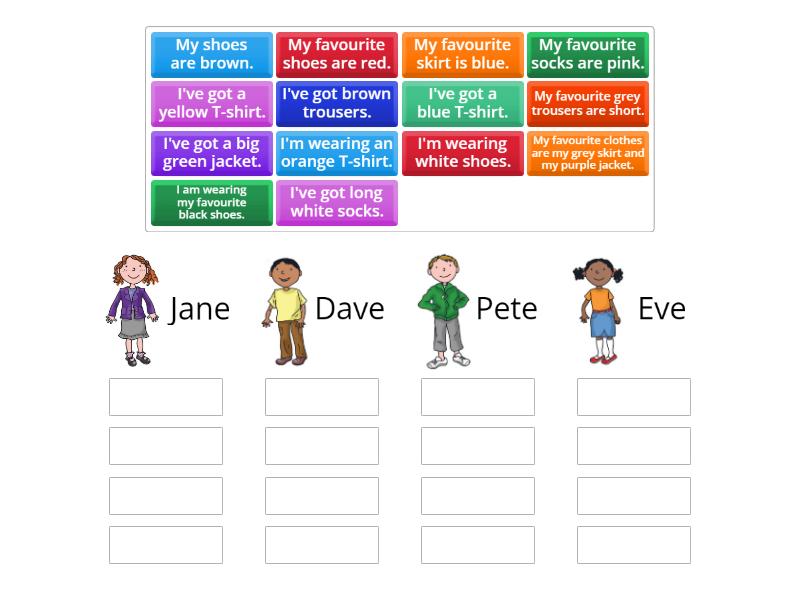 Jane: My favourite clothes are my grey skirt and my purple jacket., I am wearing my favourite black shoes., My favourite socks are pink., I've got a blue T-shirt., Dave: I've got brown trousers. , My shoes are brown., I've got a yellow T-shirt., Pete: I've got a big green jacket., My favourite grey trousers are short., I'm wearing white shoes., Eve: I'm wearing an orange T-shirt., My favourite skirt is blue., I've got long white socks., My favourite shoes are red.,
