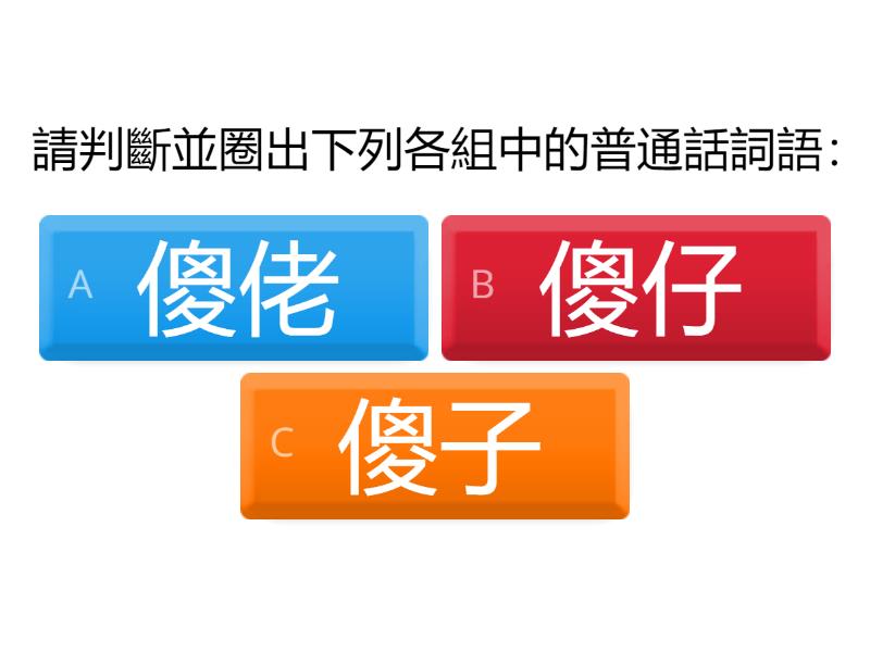 1) 請判斷並圈出下列各組中的普通話詞語: a) 傻佬 b) 傻仔 c) 傻子 2) 請判斷並圈出下列各組中的普通話詞語: a) 西紅柿 b) 紅茄 c) 紅柿 3) 請判斷並圈出下列各組中的普通話詞語: a) 激氣 b) 惱火 c) 光火 4) 請判斷並圈出下列各組中的普通話詞語: a) 細蚊仔 b) 細佬哥 c) 小孩兒 5) 請判斷並圈出下列各組中的普通話詞語: a) 擠擁 b) 擁擠 c) 擠迫 6) 請判斷並圈出下列各組中的普通話詞語: a) 衫褲 b) 外衫 c) 衣裳 7) 請判斷並圈出下列各組中的普通話詞語: a) 晏晝 b) 中午 c) 當晝 8) 請判斷並圈出下列各組中的普通話詞語: a) 扯謊 b) 大話 c) 撒謊 9) 請判斷並圈出下列各組中的普通話詞語: a) 講唔定 b) 說不定 c) 話唔定 10) 請判斷並圈出下列各組中的普通話詞語: a) 仆親 b) 跌低 c) 摔倒 11) 請判斷並圈出下列各組中的普通話詞語: a) 心裏 b) 心底 c) 心底裏 12) 請判斷並圈出下列各組中的普通話詞語: a) 唔至到 b) 唔至於 c) 不至於 13) 請判斷並圈出下列各組中的普通話詞語: a) 耳仔 b) 耳朵 c) 耳公 14) 請判斷並圈出下列各組中的普通話詞語: a) 湯丸 b) 湯團 c) 元宵 15) 請判斷並圈出下列各組中的普通話詞語: a) 水泥 b) 石英 c) 洋泥巴 16) 請判斷並圈出下列各組中的普通話詞語: a) 抹檯布 b) 抹布 c) 餐檯布 17) 請判斷並圈出下列各組中的普通話詞語: a) 谷米 b) 粟米 c) 玉米 18) 請判斷並圈出下列各組中的普通話詞語: a) 返嚟 b) 回來 c) 返來 19) 請判斷並圈出下列各組中的普通話詞語: a) 衫袖 b) 袖筒 c) 袖子 20) 請判斷並圈出下列各組中的普通話詞語: a) 絮叨 b) 吟沈 c) 說不停