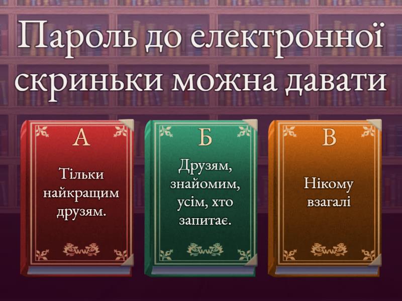 1) Пароль до електронної скриньки можна давати a) Тільки найкращим друзям. b) Друзям, знайомим, усім, хто запитає. c) Нікому взагалі 2) Чому не коректно в електронних листах застосовувати текст, набраний у ВЕРХНЬОМУ РЕГІСТРІ? a) Це сприймається у мережі як крик, і може прикро вразити вашого співрозмовника. b) Текст має негарний вигляд. c) Такі дії є коректними й загально прийнятими. 3) Чому не варто відкривати листи електронної пошти, файли або Web-сторінки, отримані від людей, яких ви реально не знаєте або не довіряєте? a) Це може зашкодити безпеці. b) Можна, адже це також спілкування. c) Із незнайомцями не можна спілкуватися. 4) Чи можна зустрічатися у реальному житті із знайомими по Інтернет-спілкуванню? a) Категорично, ні. b) Можна, але в супроводі дорослих. c) Звичайно, можна, адже ви вже познайомилися. 5) Чи можна надавати в мережі незнайомцям свої світлини та конфіденційну інформацію? a) Ні. Це тільки ваша особиста інформація, а нею можуть скористатися шахраї. b) Можна тільки світлини. c) Можна, це безпечно. 6) У мережі з незнайомими людьми можна поводитися будь-як, адже вас не знають. a) Ні. Завжди поводьтеся у мережі так, як би ви хотіли, щоб поводилися з вами! b) Так, якщо включити анонімний режим. c) Інколи можна, якщо співрозмовники не чемні. 7) Чому потрібно завжди дотримуватися правил Інтернет-безпеки? a) Вони розроблені для того, щоб ви почували себе комфортно і безпечно у мережі. b) Щоб не потрапити до в'язниці. c) Щоб не "заразити" пристрій вірусами. 8) Чи потрібно обмежувати час користування мережею Інтернет? a) Так, щоб не розвинулася залежність. b) Ні, адже це корисно й цікаво. c) Так, адже користування мережею несе за собою матеріальні витрати. 9) Скільки часу без перестанку підлітки можуть користуватися мережею? a) Без обмежень. b) Не більше доби. c) Близько двох годин. 10) Чи повинні дорослі контролювати роботу дітей в Інтернеті? a) Ні, це особисті вподобання. b) Так, щоб допомогти убезпечити. c) Інколи, коли діти про це просять.