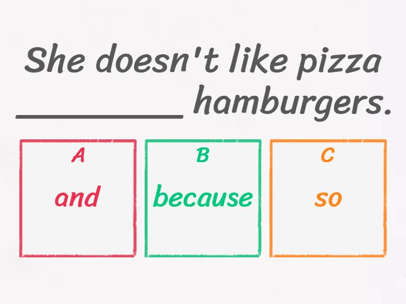 1) She doesn't like pizza _________ hamburgers.  a) and b) because c) so 2) Jenny gets up early every day __________ her husband likes to stay in bed.  a) but b) because c) or 3) Would you like to drink coffee ________ tea? a) so b) but c) or 4) There isn't a pool _________ there is a playground at this hotel. a) or b) but c) so 5) Tim ________ Jake like pop music. a) but b) because c) and 6) I enjoy reading _______ going for a walk at the weekends. a) so b) or c) but