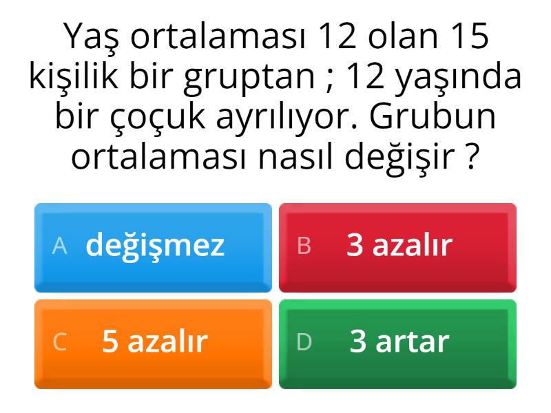 1) Yaş ortalaması 12 olan 15 kişilik bir gruptan ; 12 yaşında bir çoçuk ayrılıyor. Grubun ortalaması nasıl değişir ? a) 3 artar b) 3 azalır c) değişmez d) 5 azalır 2) 13, 17,18,12,16,14 sayılarının ortalaması kaçtır ? a) 15 b) 16 c) 20 d) 30 3) 21,18,17,35,42 sayılarının açıklığı nedir ? a) 23 b) 25 c) 27 d) 32