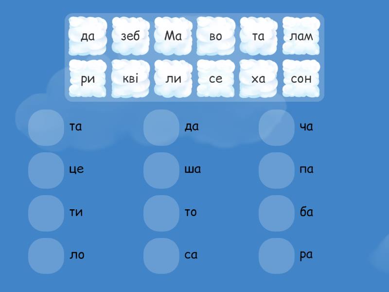 Ма - ша, се - ло, да - ча, та - то, сон - це, во - да, ли - са, ри - ба, ха - та, зеб - ра, лам - па, кві - ти,