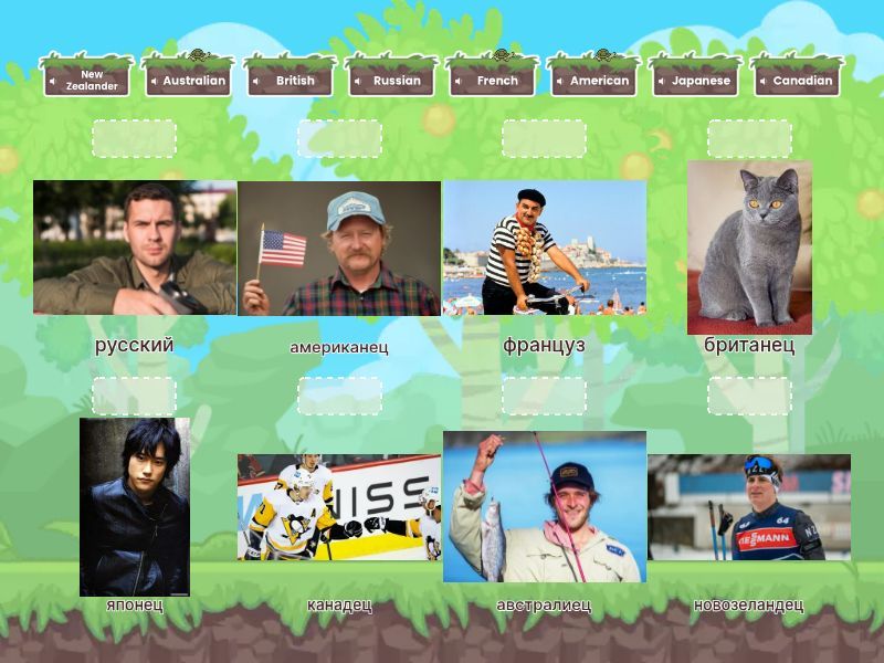 American - американец, Australian - австралиец, British - британец, New Zealander - новозеландец, Canadian - канадец, French - француз, Japanese - японец, Russian - русский,