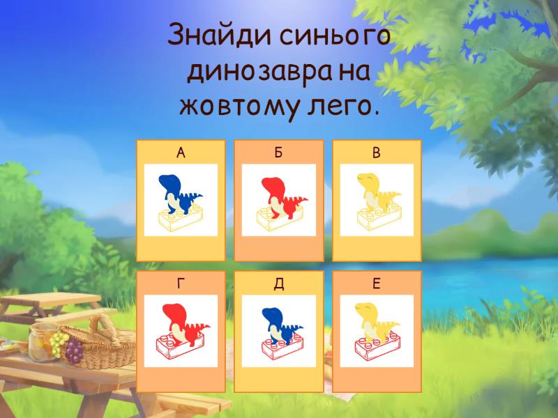 1) Знайди синього динозавра на жовтому лего. a) b) c) d) e) f) 2) Знайди червоного динозавра на жовтому лего. a) b) c) d) e) f) 3) Знайди жовтого динозавра на жовтому лего. a) b) c) d) e) f) 4) Знайди червоного динозавра на червоному лего. a) b) c) d) e) f) 5) Знайди синього динозавра на червоному лего. a) b) c) d) e) f) 6) Знайди жовтого динозавра на червоному лего. a) b) c) d) e) f) 7) Знайди жовтого динозавра на синьому лего. a) b) c) d) e) f) 8) Знайди червоного динозавра на синьому лего. a) b) c) d) e) f) 9) Знайди синього динозавра на синьому лего. a) b) c) d) e) f)