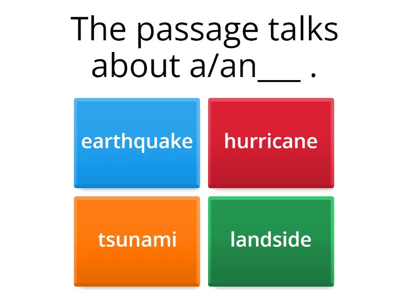 1) The passage talks about a/an___ . a) earthquake b) hurricane c) tsunami d) landside 2) The event happened in ___. a) 1960 b) 1976 c) 1967 d) 1970 3) According to the passage, which is not the sign before the event ? a) bright lights b) sea wave c) wells d) unusual animals 4) Many people came to help Tangshan, which is not mentioned in the paeagraph 4 ? a) doctors b) sodiers c) nurses d) writers 5) Why does the author say "But hopr was not lost" in paragraph 4 ? a) Many people came to help. b) People are not frightened at all c) The event was not serious. d) There is something good.