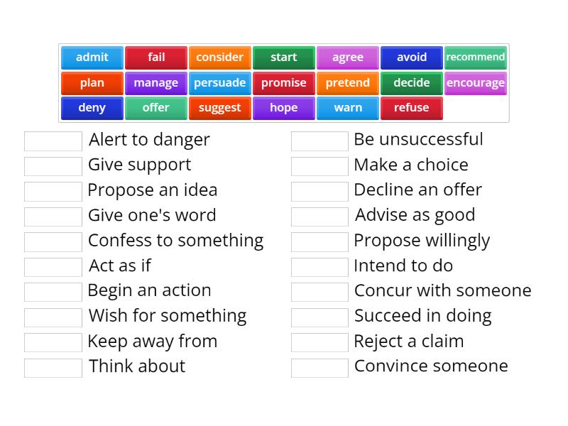 suggest - Propose an idea, refuse - Decline an offer, promise - Give one's word, persuade - Convince someone, consider - Think about, offer - Propose willingly, deny - Reject a claim, admit - Confess to something, encourage - Give support, recommend - Advise as good, start - Begin an action, avoid - Keep away from, warn - Alert to danger, hope - Wish for something, agree - Concur with someone, decide - Make a choice, manage - Succeed in doing, fail - Be unsuccessful, pretend - Act as if, plan - Intend to do,