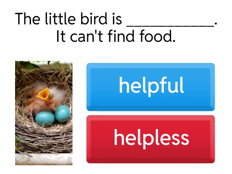 1) The little bird is ___________. It can't find food. a) helpful b) helpless 2) My dress is ------------. It is so clean. a) spotless b) hopeless 3) When someone is skillful, he is ------------. a) without skill b) full of skill 4) when you are trustful, you are ---------------. a) without trust b) full of trust 5) Leaving the water running is wasteful. a) full of waste b) without waste 6) He is hopeless to win the race . a) full of hope b) without hope