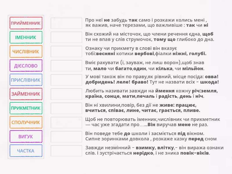 ІМЕННИК - Любить називати завжди на ймення кожну річ:земля, країна, сонце, мати,печаль і радість, день і ніч., ПРИКМЕТНИК - Ознаку чи прикмету в слові він вказує тобі:весняні котики вербові,фіалки ніжні, голубі., ЧИСЛІВНИК - Вміє рахувати (і, зауваж, не лиш ворон),щоб знав ти, мало чи багато,один, чи кілька, чи мільйон., ЗАЙМЕННИК - Щоб не повторювать іменник,числівник чи прикметник — час уже згадати про…...Він виручав мене не раз. , ДІЄСЛОВО - Він ні хвилини,повір, без дії не живе: працює, вчиться, співає, лине, читає, грається, пливе., ПРИСЛІВНИК - Завжди незмінний - взимку, влітку,- він виража ознаки слів. І зустрічається нерідко, і не зника повік-віків., ПРИЙМЕННИК - Він поведе тебе до школи і засміється під вікном. Сипне зоринками довкола , розкаже казку перед сном, СПОЛУЧНИК - Він схожий на місточок, що члени речення єдна, щоб ти не впав у слів струмочок, тому що глибоко до дна., ЧАСТКА - Про неї не забудь так само і розкажи колись мені , як важив, наче терезами, що важливіше : так чи ні, ВИГУК - У мові також він по праву,як рівний, місце посіда: овва! добридень! леле! браво! Тут не назвати всіх - шкода!,