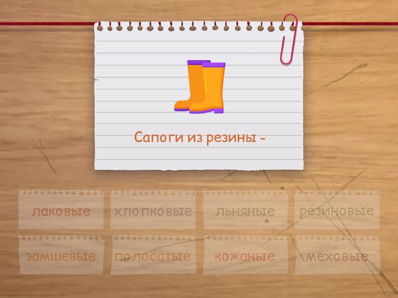 резиновые - Сапоги из резины - , кожаные - Ботинки из кожи - , замшевые - Туфли из замши - , хлопковые - Балетки из хлопка - , меховые - Сапоги с мехом - , льняные - Тапки из льна - , лаковые - Туфли покрытые лаком - , полосатые - Шлёпки в полоску - ,