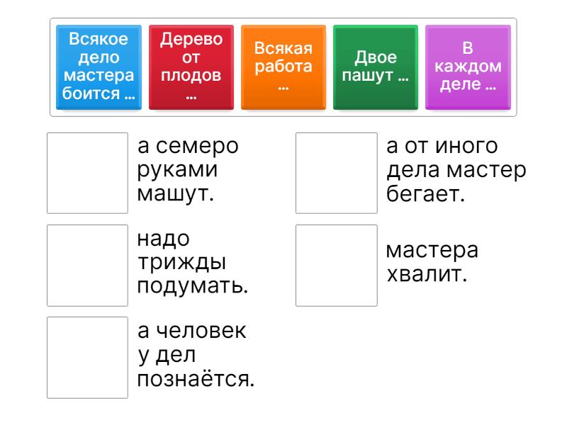 В каждом деле ... - надо трижды подумать., Двое пашут ... - а семеро руками машут., Всякое дело мастера боится ... - а от иного дела мастер бегает., Всякая работа ... - мастера хвалит., Дерево от плодов ... - а человек у дел познаётся.,