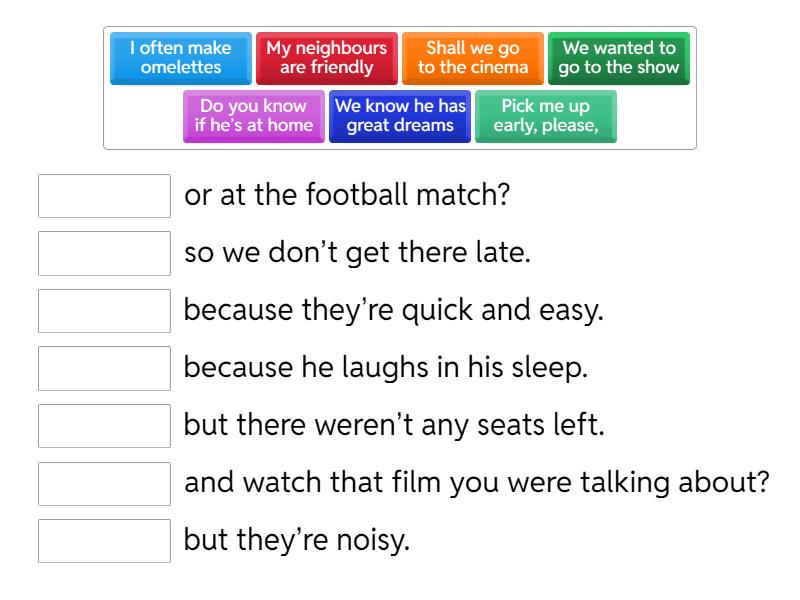 We wanted to go to the show - but there weren’t any seats left., I often make omelettes - because they’re quick and easy., Shall we go to the cinema - and watch that film you were talking about?, My neighbours are friendly - but they’re noisy., Do you know if he’s at home - or at the football match?, Pick me up early, please, - so we don’t get there late., We know he has great dreams - because he laughs in his sleep.,