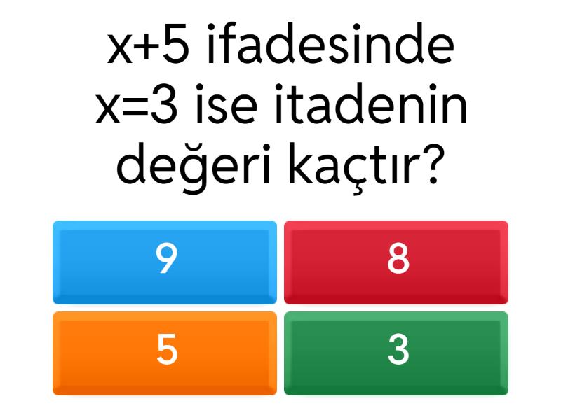 1) x+5 ifadesinde x=3 ise itadenin değeri kaçtır? a) 9 b) 8 c) 5 d) 3 2) 2y-1 ifadesinde y=4 ise ifadenin değeri kaçtır? a) 4 b) 9 c) 7 d) 3 3) 3a+2b ifadesinde a=2 ve b=3 ise ifadenin değeri kaçtır? a) 11 b) 8 c) 5 d) 12 4) 4x-2y ifadesinde x=5 ve y=2 ise ifadenin değeri kaçtır? a) 16 b) 13 c) 8 d) 4 5) 5(x+1) ifadesinde x=3 ise ifadeinin değeri kaçtır? a) 10 b) 25 c) 20 d) 15 6) 2(y-2) ifadesinde y=5 ise ifadenin değeri kaçtır? a) 6 b) 9 c) 10 d) 4 7) 3(a+b) ifadesinde a=2 ve b=3 ise ifadenin değeri kaçtır? a) 14 b) 15 c) 20 d) 10 8) 4(x-y) ifadesinde x=5 ve y=2 ise ifedenin değeri kaçtır? a) 10 b) 4 c) 12 d) 9 9) x+x+1 ifadesini en sade şekilde yazınız. a) 2x+2 b) 2y+1 c) 2x+1 d) 2y+2 10) 2+y+y ifadesini en sade şekilde yazınız. a) 2+2x b) 2+2y c) 2+3x d) 3+3y 11) 3a+2a-1 ifadesini en sade şekilde yazınız. a) 3a+2a-1 b) 5a-2 c) 3a+3a d) 5a-1 12) 2x+3 ifadesinde x=4 ise ifadenin değeri kaçtır? a) 11 b) 16 c) 19 d) 6 13) 5y-2 ifadesinde y=2 ise ifadenin değeri kaçtır? a) 7 b) 3 c) 8 d) 5 14) 3a+b ifadesinde a=3 ve b=4 ise ifadenin değeri kaçtır? a) 5 b) 13 c) 10 d) 3 15) 4x-2y ifadesinde x=5 ve y=3 ise ifadenin değeri kaçtır? a) 14 b) 9 c) 6 d) 3 16) 2(x+1) ifadesinde x=3 ise ifadenin değeri kaçtır? a) 1 b) 3 c) 8 d) 5 17) 3(y-2) ifadesinde y=5 ise ifadenin değeri kaçtır? a) 9 b) 10 c) 3 d) 5 18) 4(a+b) ifadesinde a=2 ve b=3 ise ifadenin değeri kaçtır? a) 20 b) 10 c) 15 d) 5 19) 5(x-y) ifadesinde x=6 ve y=2 ise ifadenin değeri kaçtır? a) 8 b) 15 c) 5 d) 20 20) 2x+x-3 ifadesini en sade şekilde yazalım. a) 5-1x b) 5-x c) 3x-3 d) 2x+x-3