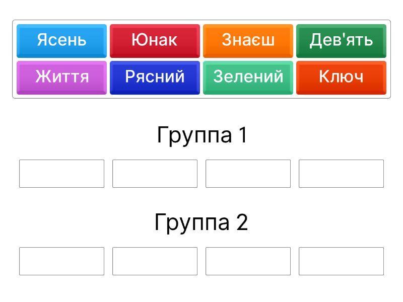 Группа 1: Ключ, Рясний, Зелений, Життя, Группа 2: Ясень, Дев'ять, Юнак, Знаєш,