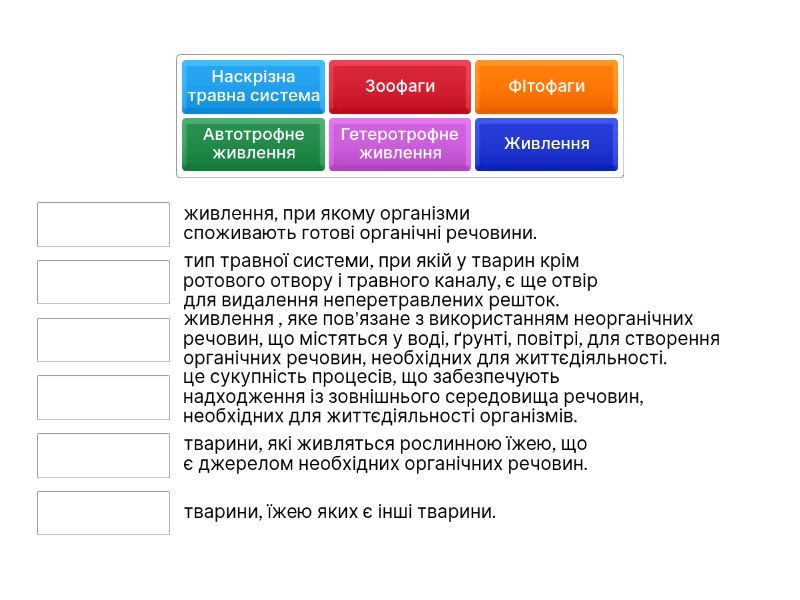 Живлення - це сукупність процесів, що забезпечують надходження із зовнішнього середовища речовин, необхідних для життєдіяльності організмів. , Автотрофне живлення - живлення , яке пов’язане з використанням неорганічних речовин, що містяться у воді, ґрунті, повітрі, для створення органічних речовин, необхідних для життєдіяльності., Гетеротрофне живлення - живлення, при якому організми споживають готові органічні речовини. , Міксотрофне живлення - живлення, при якому організми за певних умов мають здатність самостійно утворювати органічні речовини або отримувати їх з навколишнього середовища., Фотосинтез - процес, під час якого молекули хлорофілу поглинають сонячну енергію та перетворюють її на хімічну енергію склад них органічних речовин (наприклад, глюкози та крохмалю). , Фітофаги - тварини, які живляться рослинною їжею, що є джерелом необхідних органічних речовин., Зоофаги - тварини, їжею яких є інші тварини., Поліфаги - тварини, у раціоні яких наявна їжа і рослинного, і тваринного походження., Паразити - організми, які використовують інший організм (іншу тварину, рослину чи людину) як джерело живлення й середовище існування та завдають йому шкоди. , Сапрофаги - санітари природи, живляться відмерлими рештками рослин (дощові черв’яки), тварин (жуки-гробарики) або поїдають послід тварин (жуки-гнойовики)., Сліпозамкнена травна система - тип травної системи, при якій тварини (наприклад, медузи) мають ротовий отвір і кишківник для всмоктування поживних речовин, Наскрізна травна система - тип травної системи, при якій у тварин крім ротового отвору і травного каналу, є ще отвір для видалення неперетравлених решток. ,
