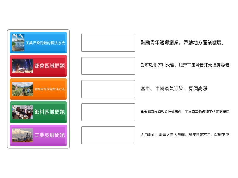 都會區域問題 - 塞車、車輛廢氣汙染、房價高漲, 鄉村區域問題 - 人口老化、老年人乏人照顧、醫療資源不足、就醫不便, 工業發展問題 - 重金屬廢水導致綠牡蠣事件、工業廢棄物處理不當汙染環境, 工業汙染問題的解決方法 - 政府監測河川水質、規定工廠設置汙水處理設備, 鄉村區域問題解決方法 - 鼓勵青年返鄉創業,帶動地方產業發展。,