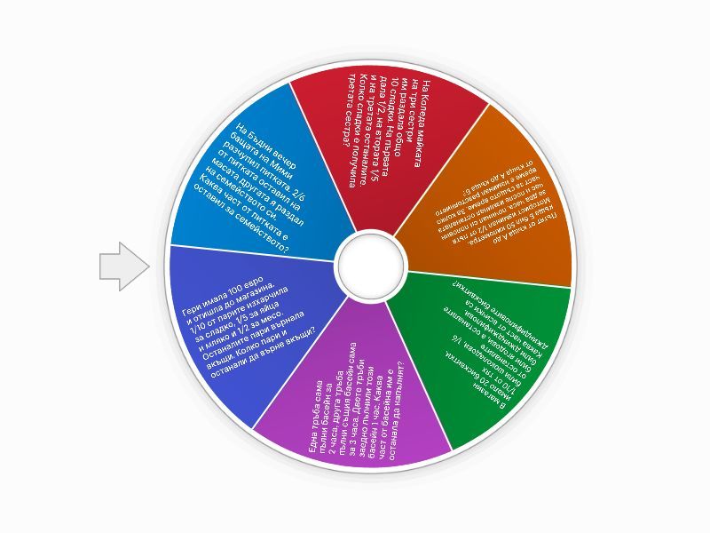 1) На Бъдни вечер бащата на Мими разчупил питката. 2/6 от питката оставил на масата другата я раздал на семейството си. Каква част от питката е оставил за семейството?  a) 3/6 b) 2/3 c) 1/3 d) 5/6 2) На Коледа майката на три сестри им раздала общо 10 сладки. На първата дала 1/2, на втората 1/5 и на третата останалите. Колко сладки е получила третата сестра?  a) 4 b) 7 c) 3 d) 2 3) Пътят от къща А до къща Б бил 50 километра. Моторист изминал 1/2 от пътя за два часа, починал си половин час и после изминал останалата част за същото време. За колко време е изминал разстоянието от къща А до къща Б?   a) 3 b) 4ч.и 30мин. c) 4 d) 5  4) В магазин имало 20 бисквитки. 1/10 от тях били шоколадови, 1/6 от останалите били ягодови, а останалите били джинджифилови. Каква част от всички са джиндифиловите бисквитки? a) 3/4 b) 5/6 c) 7/30 d) 2/3 5) Една тръба сама пълни басейн за 2 часа, друга тръба пълни същия басейн сама за 3 часа. Двете тръби заедно пълнили този басейн 1 час. Каква част от басейна им е останала да напълнят?  a) 5/6 b) 2/3 c) 1/6 d) 1/2 6) Гери имала 100 евро и отишла до магазина. 1/10 от парите изхарчила за сладко, 1/5 за яйца и мляко и 1/2 за месо. Останалите пари върнала вкъщи. Колко пари и останали да върне вкъщи?  a) 50 b) 10 c) 30 d) 20