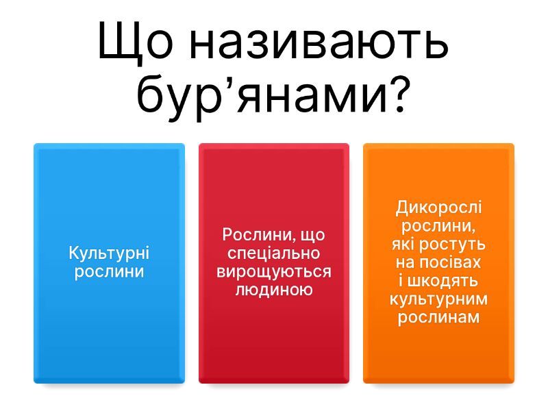 1) Що називають бур’янами? a) Культурні рослини b) Рослини, що спеціально вирощуються людиною c) Дикорослі рослини, які ростуть на посівах і шкодять культурним рослинам 2) Яку основну шкоду завдають бур’яни сільськогосподарським культурам? a) Підвищують урожай b) Приваблюють корисних комах c) Забирають воду, поживні речовини та світло 3) За тривалістю життя бур’яни поділяють на: a) Лісові та польові b) Однорічні, дворічні та багаторічні c) Коренеплідні та злакові 4) До однорічних бур’янів належить: a) Пирій повзучий b) Осот рожевий c) Лобода біла 5) Який бур’ян є багаторічним? a) Мишій b) Щириця c) Пирій повзучий 6) Який метод боротьби з бур’янами передбачає прополювання та обробіток ґрунту? a) Хімічний b) Біологічний c) Механічний 7) Застосування гербіцидів належить до: a) Механічних заходів b) Хімічних заходів c) Біологічних заходів 8) Який захід належить до агротехнічних? a) Сівозміна та своєчасний обробіток ґрунту b) Ручне прополювання c) Обприскування гербіцидами 9) Біологічний метод боротьби з бур’янами передбачає: a) Перекопування ґрунту b) Використання гербіцидів c) Застосування живих організмів для знищення бур’янів 10) Чому важливо боротися з бур’янами? a) Вони захищають ґрунт b) Вони знижують урожай і погіршують якість продукції c) Вони прикрашають поля