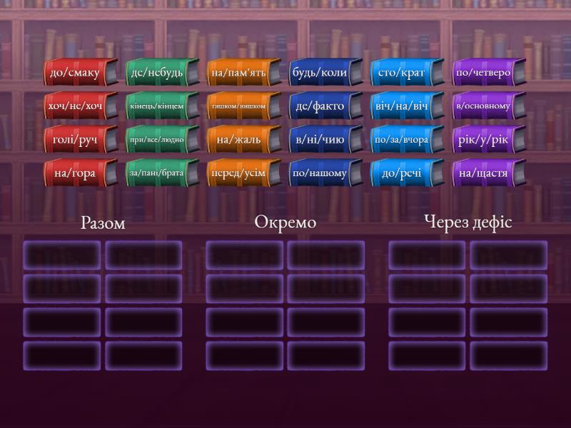 Разом: перед/усім, за/пані/брата, голі/руч, сто/крат, на/пам'ять , по/за/вчора, при/все/людно, в/ні/чию, Окремо: на/щастя, кінець/кінцем, до/смаку, рік/у/рік, в/основному, по/четверо, до/речі, на/жаль, Через дефіс: на/гора, віч/на/віч, де/небудь, тишком/нишком, по/нашому, будь/коли, де/факто, хоч/не/хоч,