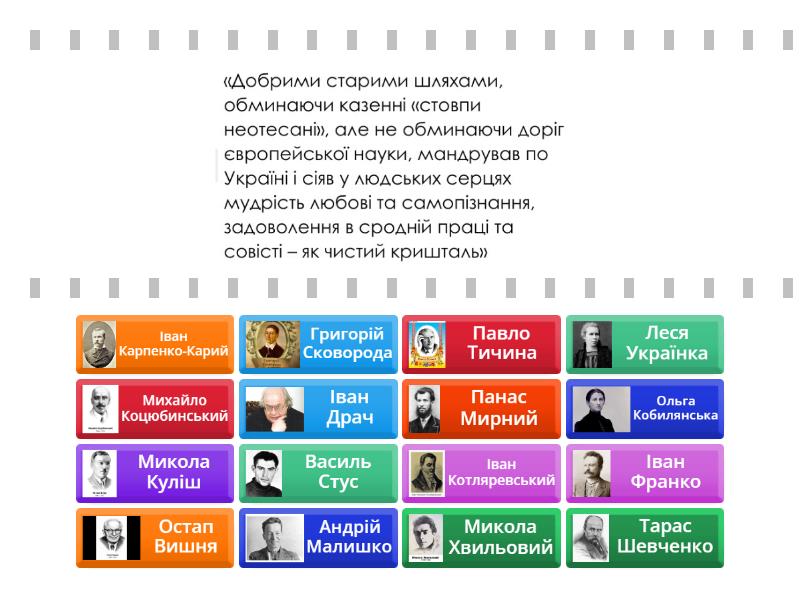 Григорій Сковорода, Павло Тичина, Остап Вишня, Микола Хвильовий, Іван Котляревський, Ольга Кобилянська, Леся Українка, Панас Мирний, Микола Куліш, Іван Драч, Михайло Коцюбинський, Іван Карпенко-Карий, Тарас Шевченко, Іван Франко, Андрій Малишко, Василь Стус,