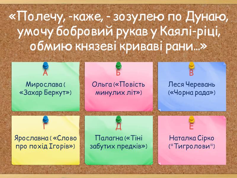 1) «Полечу, -каже, - зозулею по Дунаю, умочу бобровий рукав у Каялі-ріці, обмию князеві криваві рани...» a) Мирослава ( «Захар Беркут») b) Ольга («Повість минулих літ») c) Леся Черевань («Чорна рада») d) Ярославна ( «Слово про похід Ігорів») e) Палагна («Тіні забутих предків») f) Наталка Сірко ("Тигролови") 2) «У неї була товста, округла спина — роздобріла на довільних харчах! В її умінні любити не було нічого штучного, хоч слово «любов» було її найулюбленішим жартом... a) Маруся Кайдашиха («Кайдашева сім’я») b) Палагна («Тіні забутих предків») c) Тамара Василівна Гніда («Місто») d) Явдоха («Хіба ревуть воли, як ясла повні?») e) Меланія Черевань («Чорна рада») f) Ольга («Повість минулих літ») 3) «Хороша та бистроока, із стрічкою над чолом, і юна, смаглява від сонця, що виступає, мов горлиця... якесь дивне поєднання надзвичайної дівочої краси і суворості. Гнучка, як пантера a) Наталка Сірко ("Тигролови") b) Мавка ( «Лісова пісня») c) Марічка («Тіні забутих предків») d) Леся Черевань ( «Чорна рада») e) Мирослава Вовк ( "Захар Беркут") f) Галя («Хіба ревуть воли, як ясла повні?») 4) «Ти стояла на стільці боса, закриваючи вікна. Я стидався дивитись на твої білі стрункі ноги, але, одвівши погляд, все одно бачив їх весь час... Ти теж була в білій сукні, і на рукаві чорніла пов'язка» a) Марічка («Тіні забутих предків») b) Тереза ("Модри Камень") c) Надійка («Місто») d) Мотря Довбиш («Кайдашева сім’я») e) Мавка ( «Лісова пісня») f) Наталка Сірко ("Тигролови") 5) « Глуха до пісні, завжди щось спотворить. Все вишиває прошви подушóк. Ще як мовчить,— нічого. Заговорить,— гостренькі зуби — чисто ховрашок» a) Килина ( «Лісова пісня») b) Катерина («Катерина») c) Дідона ( «Енеїда») d) Галя Вишняк ( «Маруся Чурай») e) Леся Черевань («Чорна рада») f) Наталка ( «Наталка Полтавка») 6) «То була молода, гарна дівчина, одіта в полотняну, шовковими нитками перетикану одежу, з невеличким бобровим ковпаком на голові, що не міг вмістити в собі її багатого, буйного, золотисто-жовтого волосся. Через плечі у неї перевішений був лук з турового рога і сагайдак зо стрілами» a) Мирослава Вовк («Захар Беркут») b) Тереза ("Модри Камень") c) Наталка Сірко ( «Тигролови») d) Маруся Чурай («Маруся Чурай») e) Софія ( "Три зозулі з поклоном") f) Ольга («Повість минулих літ») 7) «Вона була малесенька й така прудка, і очі мала такі видющі й гострі, що сховатись од неї не могло ніщо світі. Їй можна було по три дні не давати їсти. Але без прокльонів вона не могла прожити й дня. Вони були її духовною їжею» a) Баба Палажка («Кайдашева сім’я») b) Явдоха (Хіба ревуть воли…») c) Горпина Чурай ("Маруся Чурай") d) Маруся Кайдашиха («Кайдашева сім’я») e) Горпина Терпилиха ( "Наталка Полтавка") f) Прабаба Марусина («Зачарована Десна») 8) «Вона складена була з двох тонів, без жодних переходів між ними — чорного: волосся, очі, сукня й лаковані черевики, та смуглого: обличчя, тіло рук і плеча та панчохи, і це просте поєднання надавало її постаті гордого чару; жодних кучерів чи гребінців у рівній зачісці, жодних прикрас чи гаптування в рівній сукні» a) Тайах ( «Майстер корабля») b) Рита ( «Місто») c) Тереза ("Модри Камень") d) Наталка Сірко ( «Тигролови») e) Ганна ("Valse melancolique") f) Поля ( "Майстер корабля") 9) «Біля вікна сиділа жінка — білоголова, стрижена, в англійській блузці, поклавши довгі ноги на стілець перед собою. Вона палила, дмухаючи в вікно, і ледве подивилася на мене... Вона трималася так, ніби їй шлейф нес