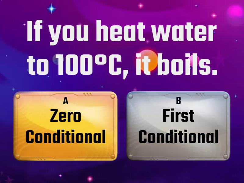 1) If you heat water to 100°C, it boils. a) Zero Conditional b) First Conditional 2)  If I miss the bus, I will take the train. a) Zero Conditional b) First Conditional 3) I’ll call you if I’m late. a) Zero Conditional b) First Conditional 4) If you drink too much soda, you’ll get fat. a) Zero Conditional b) First Conditional 5) People get hungry if they don’t eat. a) Zero Conditional b) First Conditional 6) If you finish all your work, you can go home early. a) Zero Conditional b) First Conditional 7) Water freezes if you cool it to 0°C. a) Zero Conditional b) First Conditional 8) If you get hungry later, you can order some pizza. a) Zero Conditional b) First Conditional 9) When you freeze water, it becomes ice. a) Zero Conditional b) First Conditional 10) If we don’t arrive on time, our manager will be angry. a) Zero Conditional b) First Conditional 11) My teacher gets angry when I am late for class. a) Zero Conditional b) First Conditional 12) When I cross the street, I always look left and right. a) Zero Conditional b) First Conditional 13) My brother will wash his car today if he has enough time. a) Zero Conditional b) First Conditional 14) Tea tastes sweet if you add some sugar. a) Zero Conditional b) First Conditional 15) If the weather is nice at the weekend, we can go to the beach. a) Zero Conditional b) First Conditional 16) Which conditional do we use for general facts, routines or habits? a) Zero Conditional b) First Conditional 17) Which conditional do we use for real future events? a) Zero Conditional b) First Conditional