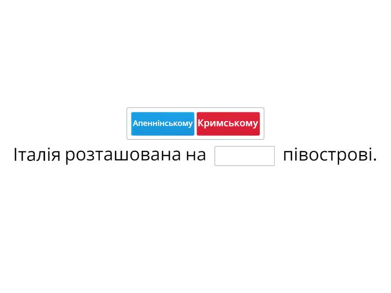 Італія розташована на ____ півострові. Італія перекладається як країна ____. Як і ____, Італія поділялася на історичні області, пов’язані з розселенням племен. Приблизно в 10 ст. до н. е. північніше від річки Тибр оселилися ____. У 4 ст. до н. е. з півночі в Італію прийшли ____ - кельтські племена, які оселилися в північній частині півострова. ____ разом із царем затверджував або відхиляв рішення народних зборів, які існували як зібрання по куріях. Усього в історії держави було ____ царів.