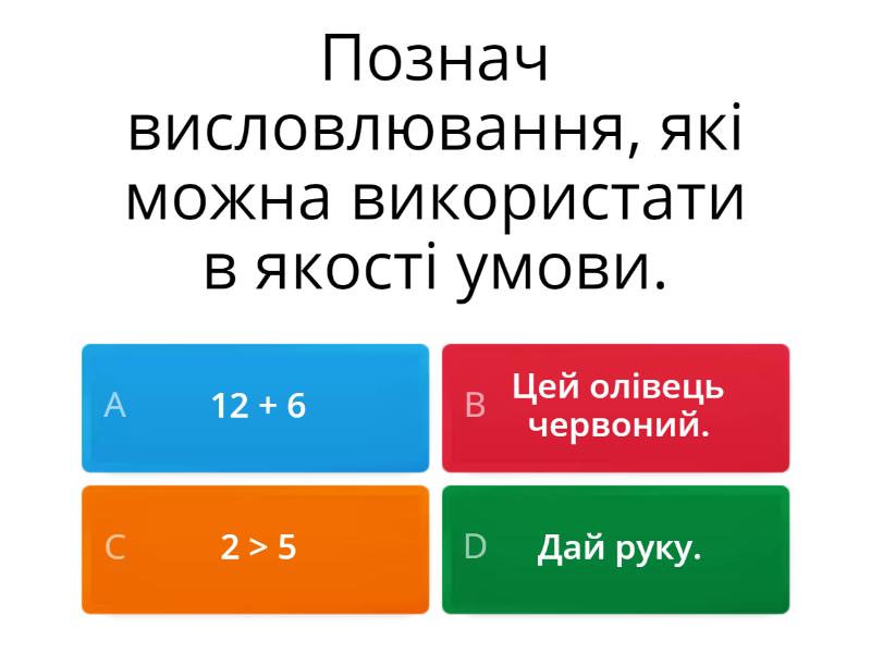 1) Познач висловлювання, які можна використати в якості умови. a) 12 + 6 b) Цей олівець червоний. c) 2 > 5 d) Дай руку. 2) Умова – це ... a) логічний оператор. b) операція порівняння. c) твердження, яке може бути істинним або хибним. 3) Знайди значення логічного виразу х >2 and х < 10, якщо х = 7 a) True   b) False 4) Знайди значення логічного виразу х >2 and х < 10, якщо х = 12 a) True b) False
