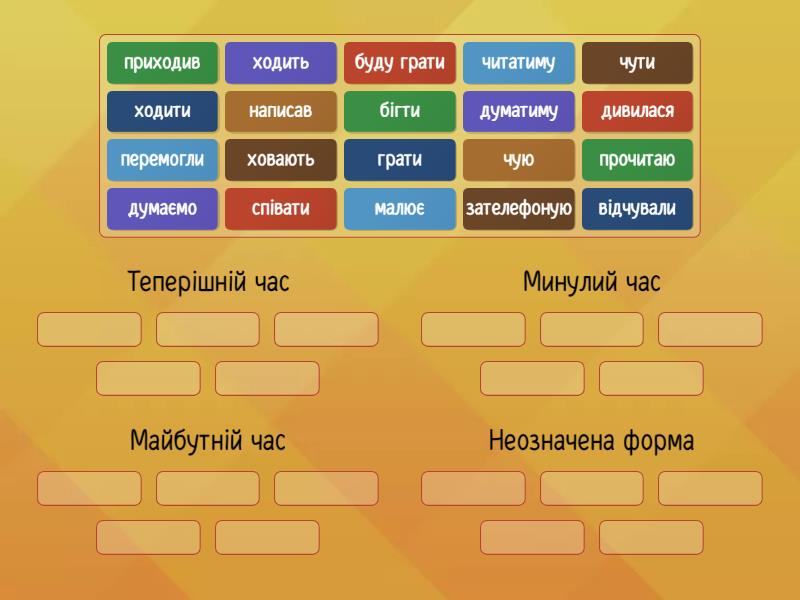 Теперішній час: чую, малює, ходить, ховають, думаємо, Минулий час: приходив, відчували, дивилася, написав, перемогли, Майбутній час: прочитаю, буду грати, читатиму, зателефоную, думатиму, Неозначена форма: ходити, чути, грати, співати, бігти,