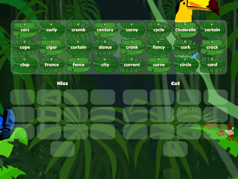 Hiss: city, circle, cigar, Cinderella, certain , century , dance, fancy, cycle, fence, France, Cut: cape, corny, crank, curve, curtain, cars, crumb, cork , crack, clap, curly, card, current ,