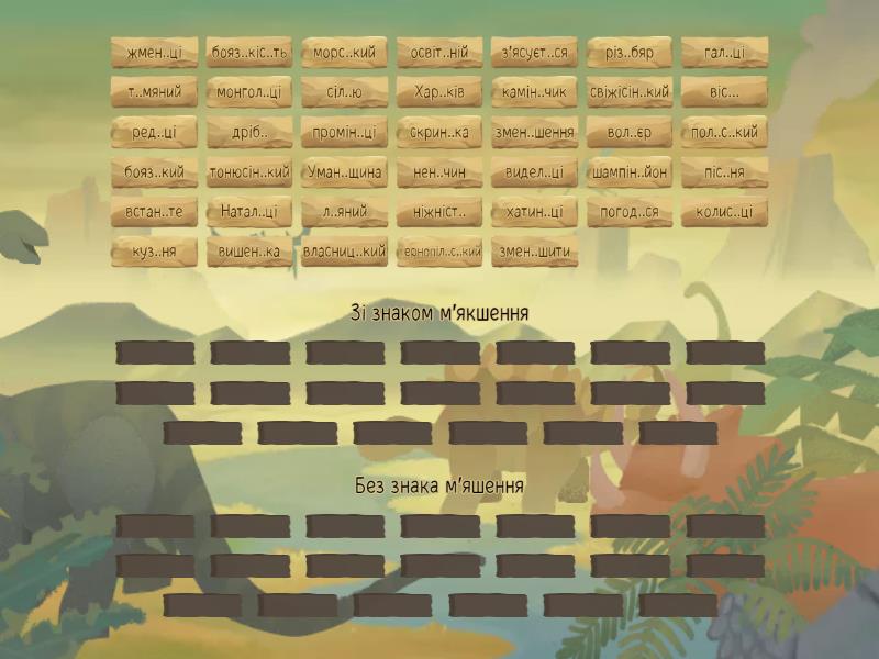 Зі знаком м'якшення: шампін..йон, нен..чин, жмен..ці, власниц..кий, вишен..ка, вол..єр, тонюсін..кий, погод..ся, встан..те, ред..ці, свіжісін..кий, пол..с..кий, різ..бяр, т..мяний, морс..кий, скрин..ка, тернопіл..с..кий, віс..., з'ясуєт..ся, ніжніст.., Без знака м'яшення: бояз..кіс..ть, Уман..щина, видел..ці, змен..шити, бояз..кий, піс..ня, гал..ці, змен..шення, л..яний, сіл..ю, Хар..ків, монгол..ці, колис..ці, Натал..ці, куз..ня, хатин..ці, дріб.., камін..чик, освіт..ній, промін..ці,